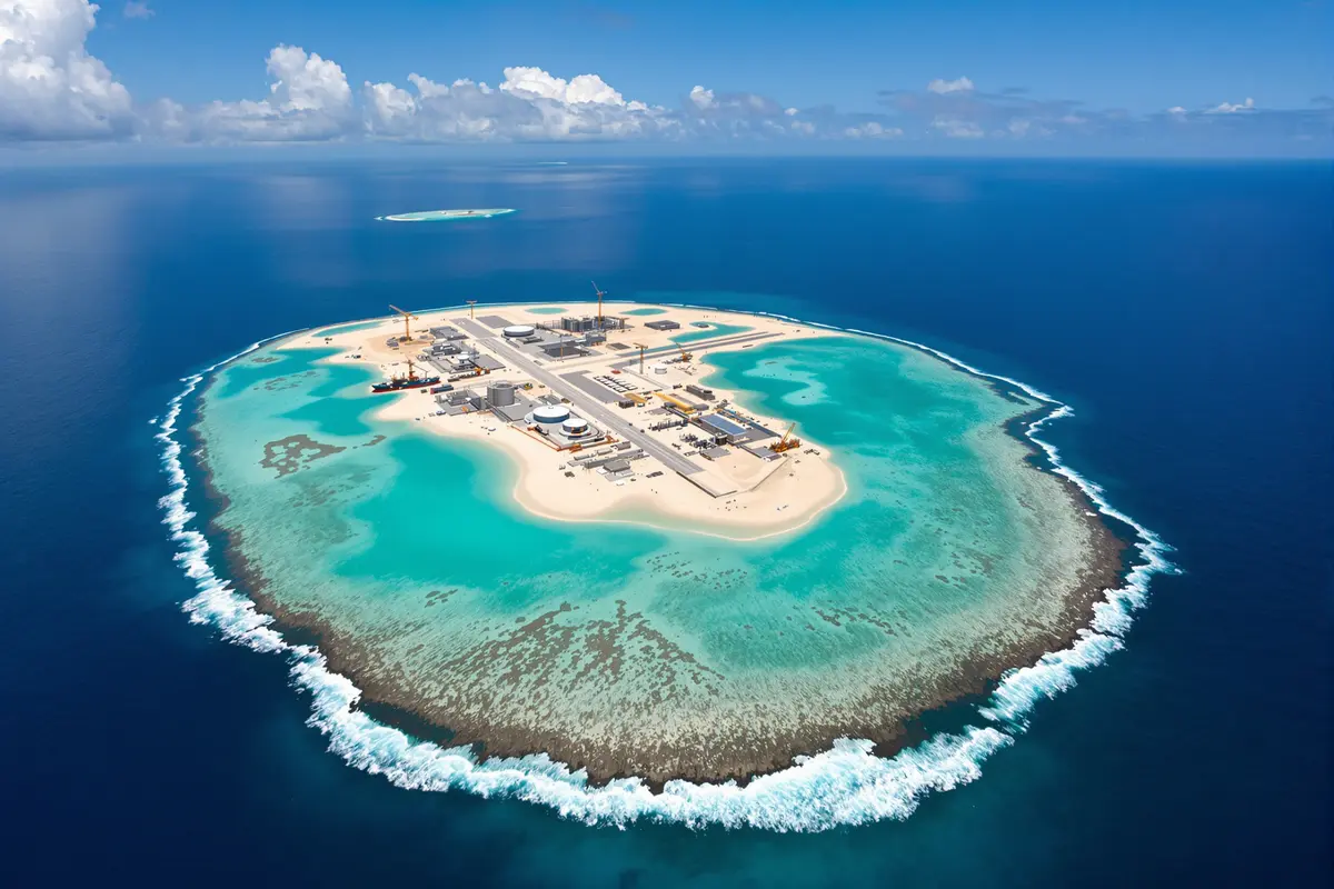 One example is Subi Reef. Once a shallow ring of coral barely above water, dredging turned it into an island larger than many city blocks—with basketball courts, solar arrays, and a port for big ships.